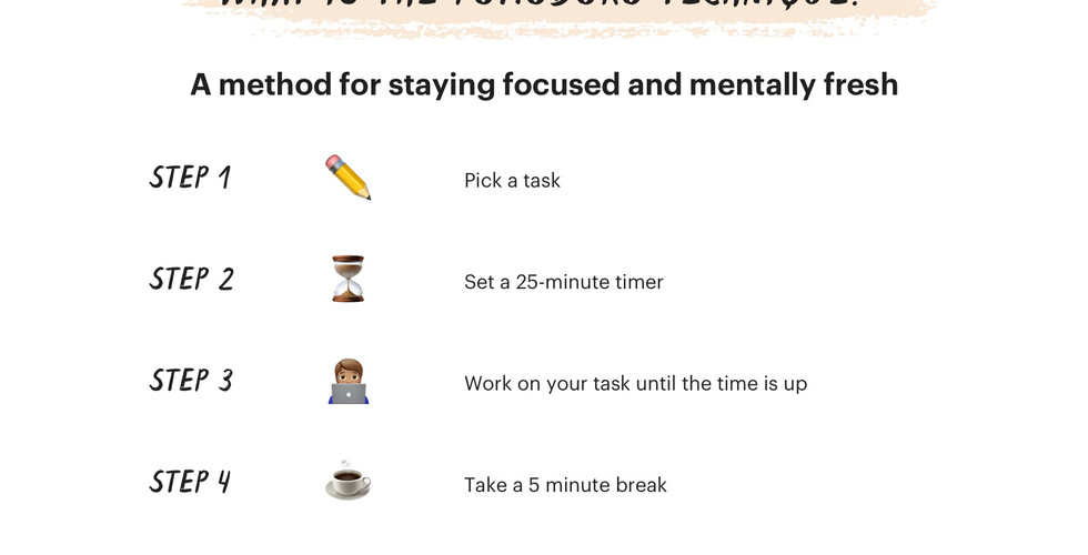 The first step is to write a to-do list and take one of your kitchen timers or simply use your phone. Set the timer for 25 min and start studying, while focusing only on one single task. When the timer rings take a 5 min break, where you could go outside or eat a snack. After the short break, you reset the timer at 25 min and start your second study session.